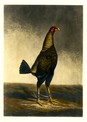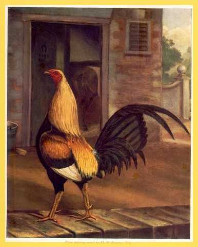 G. à D. : Combattant anglais , type ancien ( Old English Game ) gravure du Feathered World -