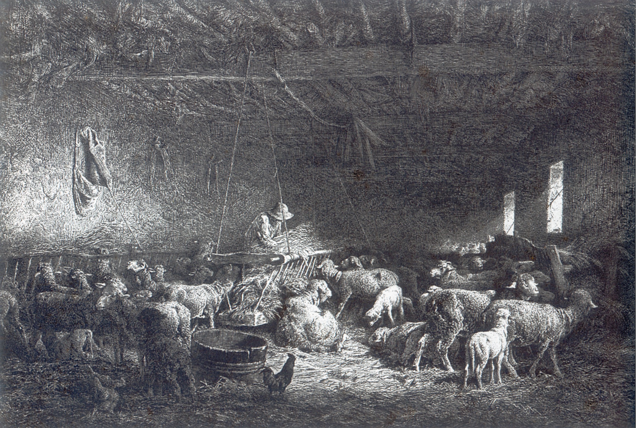 De gauche à droite : Marie et Emile ( enfants de C.Jacque ) donnant à manger à des poules - Coq et poules ( Musée des Beaux Arts de Troyes ) - La Grande Bergerie , eau forte , 1859